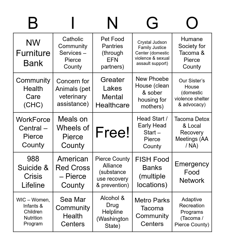 This bingo card has a free space and 50 words: Access Pierce County, Adaptive Recreation Programs (Tacoma / Pierce County), AIDS Healthcare Foundation (Tacoma services), Alcohol & Drug Helpline (Washington State), American Red Cross – Pierce County, Associated Ministries of Tacoma‑Pierce County, Catholic Community Services – Pierce County, Child Care Aware of Washington – Pierce County, Community Health Care (CHC), Comprehensive Life Resources (CLR), Concern for Animals (pet veterinary assistance), Crystal Judson Family Justice Center (domestic violence & sexual assault support), Emergency Food Network, FISH Food Banks (multiple locations), Good Samaritan Behavioral Health (MultiCare), Goodwill Job Training & Resource Centers, Greater Lakes Mental Healthcare, Head Start / Early Head Start – Pierce County, Hope Furnishings (Tacoma), Humane Society for Tacoma & Pierce County, Meals on Wheels of Pierce County, Metro Parks Tacoma Community Centers, NW Furniture Bank, New Phoebe House (clean & sober housing for mothers), Nourish Pierce County, Northwest Justice Project (free legal help), Our Sister’s House (domestic violence shelter & advocacy), Oxford House – Pierce County (sober living), Pet Food Pantries (through EFN partners), Pierce County Alliance (substance use recovery & prevention), Pierce County Clothing Banks, Pierce Transit Reduced Fare Program, Puget Sound Energy Assistance Programs, Salvation Army Tacoma Corps, Sea Mar Community Health Centers, Senior Information & Assistance Line, Sound Generations (senior & caregiver support), St. Leo’s Food Connection, St. Vincent de Paul – Pierce County, Tacoma Detox & Local Recovery Meetings (AA / NA), Tacoma Recovery Center (detox & withdrawal management), Tacoma Rescue Mission, Washington 2‑1‑1, Washington HIV/AIDS Hotline, WIC – Women, Infants & Children Nutrition Program, WorkForce Central – Pierce County, YMCA of Pierce & Kitsap Counties, YWCA Pierce County (domestic violence services), 988 Suicide & Crisis Lifeline and Victim Support Services of Pierce County.