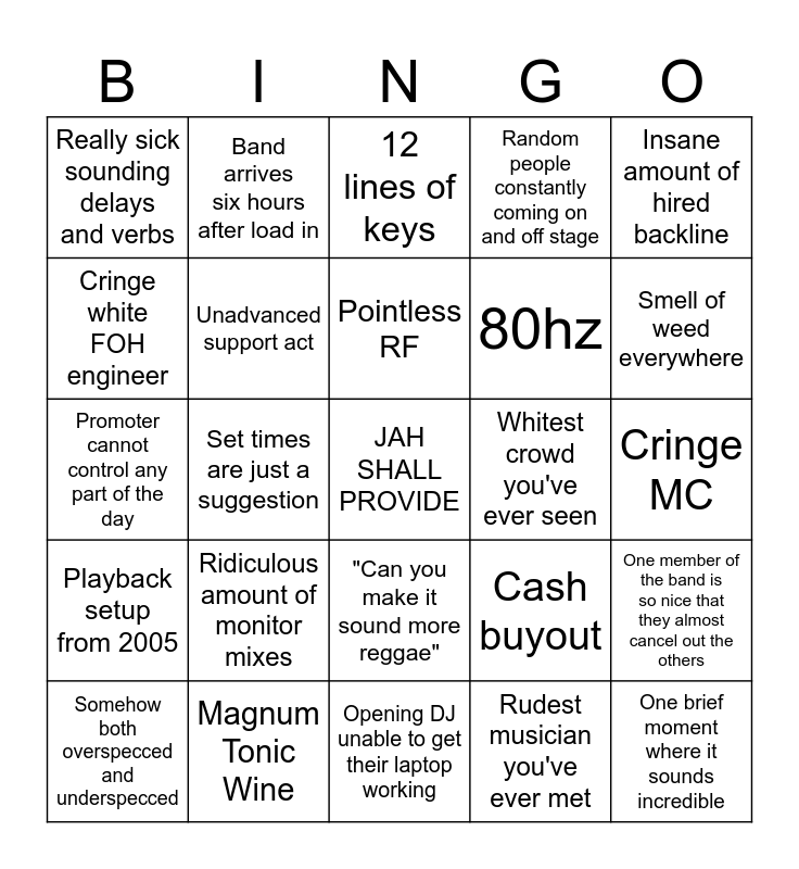 This bingo card has a free space and 24 words: Ridiculous amount of monitor mixes, Magnum Tonic Wine, Pointless RF, Somehow both overspecced and underspecced, Insane amount of hired backline, Really sick sounding delays and verbs, Cringe white FOH engineer, Band arrives six hours after load in, Whitest crowd you've ever seen, "Can you make it sound more reggae", 80hz, Promoter cannot control any part of the day, Cash buyout, One member of the band is so nice that they almost cancel out the others, Unadvanced support act, Rudest musician you've ever met, Cringe MC, 12 lines of keys, Smell of weed everywhere, Set times are just a suggestion, One brief moment where it sounds incredible, Playback setup from 2005, Random people constantly coming on and off stage and Opening DJ unable to get their laptop working.