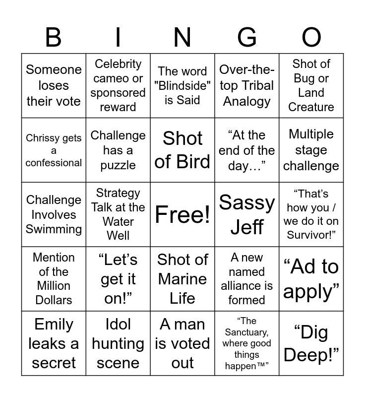 This bingo card has a free space and 40 words: Challenge Involves Throwing, Challenge Involves Swimming, Challenge Involves Climbing, Challenge has a puzzle, Idol hunting scene, Shot of Marine Life, Shot of Bird, Shot of Bat, Shot of Bug or Land Creature, Mention of the Million Dollars, Strategy Talk at the Water Well, Over-the-top Tribal Analogy, “Dig Deep!”, “That’s how you / we do it on Survivor!”, Sassy Jeff, “Let’s get it on!”, Someone says the word “vibe” or “vibes”, Someone loses their vote, Egregious drone shot at challenge, The word "Blindside" is Said, “Ad to apply”, “The Sanctuary, where good things happen™”, “At the end of the day…”, Chrissy gets a confessional, Bitter vote out reaction, Idol or advantage is played, Someone is labeled the "easy vote", Everyone goes to tribal, Someone mentions their home town or state, Someone loses their vote, "Billie Eilish Boomerang Idol™", Emily leaks a secret, Someone says they're on "damage control", A new named alliance is formed, Multiple stage challenge, A man is voted out, A woman is voted out, Coach calls himself the Dragon Slayer, Celebrity cameo or sponsored reward and Flashback to a previous season.