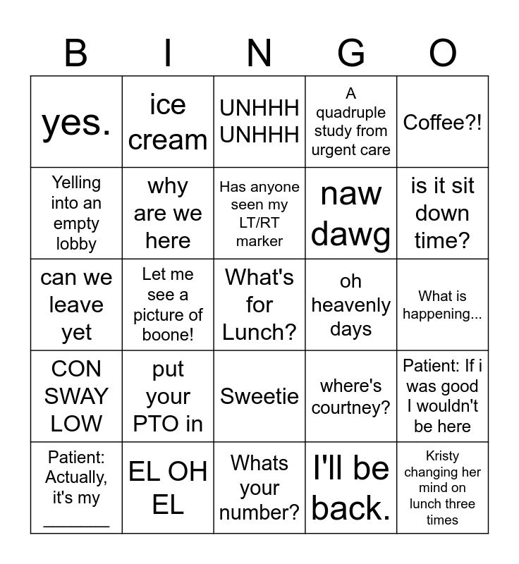 This bingo card has a free space and 30 words: EL OH EL, your late, Let me see a picture of boone!, They are late, they can wait, yes., UNHHH UNHHH, why are we here, Sweetie, oh heavenly days, Whats your number?, What is happening..., Kristy changing her mind on lunch three times, I'll be back., These people., is it sit down time?, I'm so hungry i'm gonna throw up, where's courtney?, CON SWAY LOW, put your PTO in, Coffee?!, can we leave yet, Who wants to play a game, ice cream, naw dawg, Yelling into an empty lobby, A quadruple study from urgent care, Patient: If i was good I wouldn't be here, Patient: Actually, it's my _______, Has anyone seen my LT/RT marker and Leslie's laugh that can be heard from space.