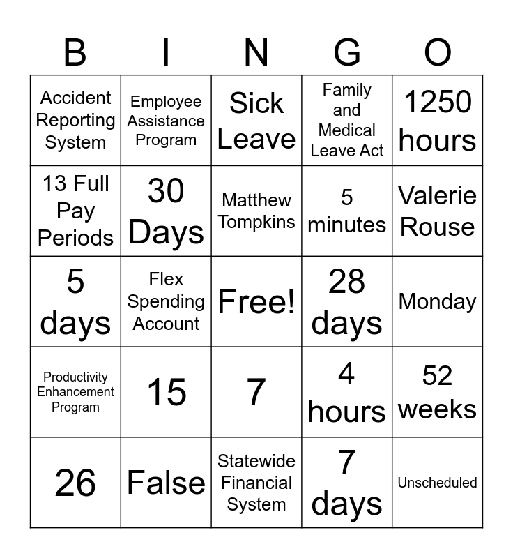 This bingo card has a free space and 35 words: Vacation Leave, FMLA, Betsy Parmley, 30 Days, 7, Family and Medical Leave Act, 13 Full Pay Periods, 12 Weeks, Matthew Tompkins, Administrative Services Director, 5 days, 1250 hours, Civil Service Employees Association, Leave and Attendance Tracking System, Accident Reporting System, 28 days, 7 days, Flex Spending Account, Productivity Enhancement Program, Unscheduled, 4 hours, 26, 52 weeks, False, Sick Leave, Valerie Rouse, beginning of the next pay period, Unauthorized, 5 minutes, Monday, True, Statewide Financial System, 15, Employee Assistance Program and PER79a.