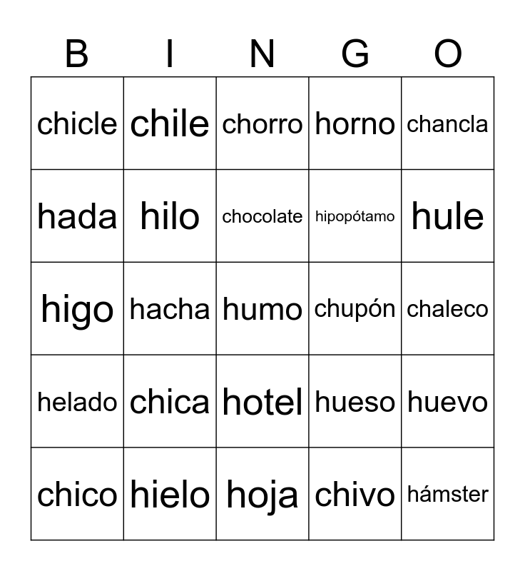 This bingo card has a free space and 24 words: chico, chica, chocolate, chivo, chancla, chicle, chile, chorro, chupón, chaleco, higo, hilo, hueso, huevo, hada, hielo, hoja, horno, hule, helado, hacha, hotel, hipopótamo and hámster.