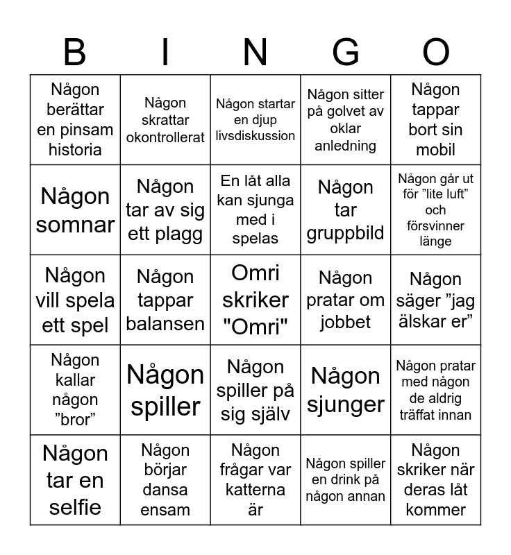 This bingo card has a free space and 24 words: Någon spiller, Någon börjar dansa ensam, En låt alla kan sjunga med i spelas, Någon tar en selfie, Någon tappar bort sin mobil, Någon berättar en pinsam historia, Någon somnar, Någon skrattar okontrollerat, Någon pratar om jobbet, Någon spiller på sig själv, Någon tar gruppbild, Någon vill spela ett spel, Någon sjunger, Någon pratar med någon de aldrig träffat innan, Någon tar av sig ett plagg, Någon spiller en drink på någon annan, Någon säger ”jag älskar er”, Någon startar en djup livsdiskussion, Någon går ut för ”lite luft” och försvinner länge, Någon tappar balansen, Någon skriker när deras låt kommer, Någon kallar någon ”bror”, Någon sitter på golvet av oklar anledning and Någon frågar var katterna är.