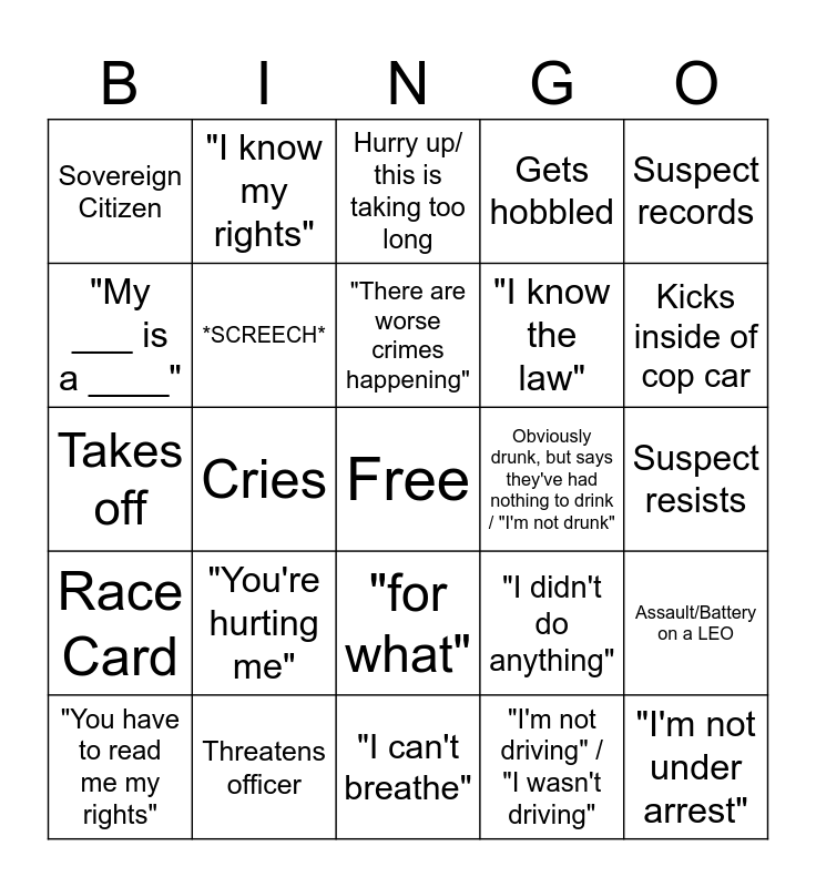 This bingo card has a free space and 47 words: "Let me go" / "stop touching me", "I'm not under arrest", "I'm suing you", "I can't breathe", "You're hurting me", "Is your bodycam on?", "I know my rights", "That's illegal", "My ___ is a ____", "HELP!", *SCREECH*, Gets hobbled, Assault/Battery on a LEO, "I didn't do anything", Spits, "What did I do??", "There are worse crimes happening", Obviously drunk, but says they've had nothing to drink / "I'm not drunk", Slips cuffs, Suspect records, Cries, "I'm not driving" / "I wasn't driving", Sovereign Citizen, "I know the law", Trespassing, Kicks inside of cop car, "You have to read me my rights", "Bro", "for what", Race Card, taser deployed, "it's not mine", "Don't touch me", Field sobriety, Pepper spray, Threatens officer, Suspect resists, "I wanna go home", "Can my ___ just pick me/car up?", But I have kids, Active warrant, Hurry up/ this is taking too long, Takes off, "I'm scared", "name and badge number", Refuses to identify and "can I call ___".