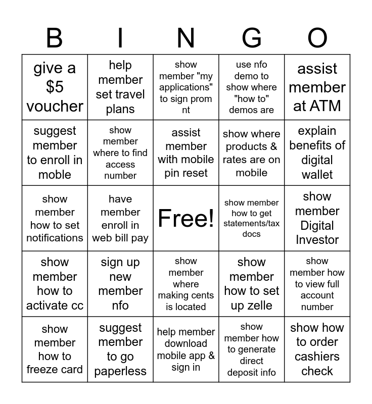 This bingo card has a free space and 24 words: sign up new member nfo, suggest member to go paperless, assist member with mobile pin reset, show member how to freeze card, assist member at ATM, give a $5 voucher, suggest member to enroll in moble, help member set travel plans, show member how to get statements/tax docs, show member where making cents is located, show where products & rates are on mobile, show member how to set notifications, show member how to set up zelle, show member how to view full account number, show member where to find access number, show member how to generate direct deposit info, show member Digital Investor, show member "my applications" to sign prom nt, explain benefits of digital wallet, have member enroll in web bill pay, show how to order cashiers check, show member how to activate cc, use nfo demo to show where "how to" demos are and help member download mobile app & sign in.
