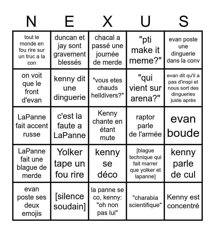 This bingo card has a free space and 24 words: Yolker tape un fou rire, [silence soudain], "vous etes chauds helldivers?", evan poste ses deux emojis, evan poste une dinguerie dans la conv, tout le monde en fou rire sur un truc a la con, on voit que le front d'evan, duncan et jay sont gravement blessés, raptor parle de l'armée, kenny se déco, "qui vient sur arena?", LaPanne fait accent russe, [blague technique qui fait marrer que yolker et lapanne], kenny parle de cul, kenny dit une dinguerie, "charabia scientifique", evan boude, chacal a passé une journée de merde, evan dit qu'il a pas d'inspi et nous sort des dingueries juste après, c'est la faute a LaPanne, Kenny est concentré, LaPanne fait une blague de merde, "pti make it meme?" and la panne se co, kenny: "oh non pas lui".