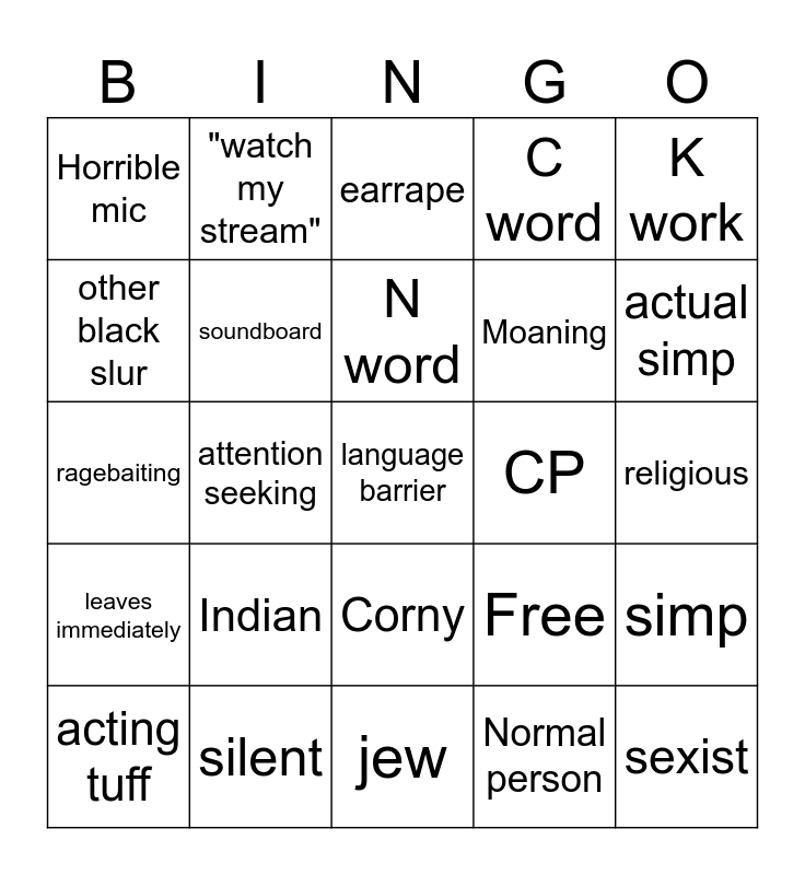This bingo card has 25 words: Indian, jew, N word, acting tuff, K work, Horrible mic, other black slur, "watch my stream", CP, Corny, Moaning, ragebaiting, Free, simp, soundboard, sexist, religious, earrape, actual simp, attention seeking, language barrier, silent, leaves immediately, C word and Normal person.