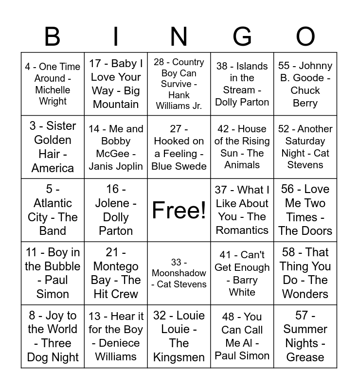 This bingo card has a free space and 60 words: 1 - I'm so Excited - Pointer Sisters, 13 - Hear it for the Boy - Deniece Williams, 25 - Morning Train - Sheena Easton, 37 - What I Like About You - The Romantics, 49 - All Right Now - Free, 2 - Centerfield - John Fogarty, 14 - Me and Bobby McGee - Janis Joplin, 26 - If You Could Read My Mind - Gordon Lightfoot, 38 - Islands in the Stream - Dolly Parton, 50 - Help From My Friends - Joe Cocker, 3 - Sister Golden Hair - America, 15 - Summer in the City - Lovin Spoonful, 27 - Hooked on a Feeling - Blue Swede, 39 - Called to Say I Love You - Stevie Wonder, 51 - You're So Vain - Carly Simon, 4 - One Time Around - Michelle Wright, 16 - Jolene - Dolly Parton, 28 - Country Boy Can Survive - Hank Williams Jr., 40 - Feel Like Makin Love - Bad Company, 52 - Another Saturday Night - Cat Stevens, 5 - Atlantic City - The Band, 17 - Baby I Love Your Way - Big Mountain, 29 - Bad Moon Rising - C.C.R., 41 - Can't Get Enough - Barry White, 53 - Be Good Johnny - Men At Work, 6 - Ever Seen the Rain - C.C.R., 18 - Hello, I Love You - The Doors, 30 - Here Comes the Sun - George Harrison, 42 - House of the Rising Sun - The Animals, 54 - Hurricane - Bob Dylan, 7 - Hurts So Good - John Mellencamp, 19 - I Can See Clearly Now - Jimmy Cliff, 31 - Heard It Through the Grapevine - Marvin Gaye, 43 - Jessie's Girl - Rick Springfield, 55 - Johnny B. Goode - Chuck Berry, 8 - Joy to the World - Three Dog Night, 20 - Kokomo - Beach Boys, 32 - Louie Louie - The Kingsmen, 44 - Love Me Do - The Beatles, 56 - Love Me Two Times - The Doors, 9 - Me and Julio - Paul Simon, 21 - Montego Bay - The Hit Crew, 33 - Moonshadow - Cat Stevens, 45 - Sultans of Swing - Dire Straits, 57 - Summer Nights - Grease, 10 - Susie Q - C.C.R., 22 - Sweet Home Alabama - Lynyrd Skynyrd, 34 - Sylvia's Mother - Dr. Hook, 46 - Tequila Sunrise - The Eagles, 58 - That Thing You Do - The Wonders, 11 - Boy in the Bubble - Paul Simon, 23 - Boots Are Made for Walkin - Nancy Sinatra, 35 - Tin Man - America, 47 - Twist and Shout - The Beatles, 59 - Uptown Girl - Paul Simon, 12 - Wake me up Before You Go-Go - Wham!, 24 - Who Can It Be Now - Men At Work, 36 - Dreams - Fleetwood Mac, 48 - You Can Call Me Al - Paul Simon and 60 - Crazy - Patsy Cline.