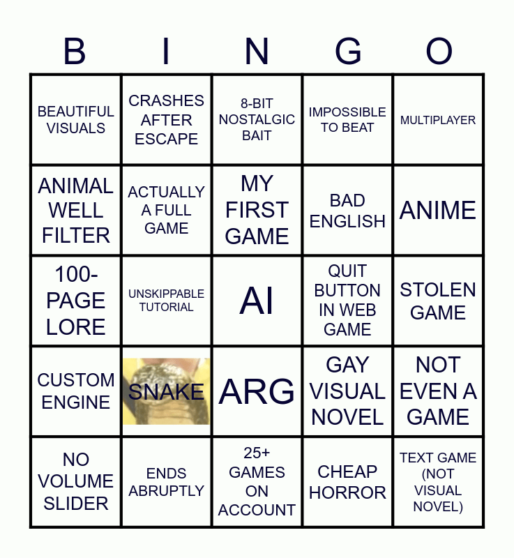 This bingo card has 1 images, a free space and 24 words: SNAKE, ENDS ABRUPTLY, MY FIRST GAME, NO VOLUME SLIDER, MULTIPLAYER, BEAUTIFUL VISUALS, ANIMAL WELL FILTER, CRASHES AFTER ESCAPE, QUIT BUTTON IN WEB GAME, ARG, BAD ENGLISH, 100-PAGE LORE, GAY VISUAL NOVEL, NOT EVEN A GAME, ACTUALLY A FULL GAME, CHEAP HORROR, STOLEN GAME, 8-BIT NOSTALGIC BAIT, ANIME, UNSKIPPABLE TUTORIAL, TEXT GAME (NOT VISUAL NOVEL), CUSTOM ENGINE, IMPOSSIBLE TO BEAT and 25+ GAMES ON ACCOUNT.