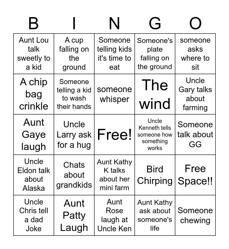 This bingo card has a free space and 29 words: Uncle Chris tell a dad Joke, the wind, Uncle Larry ask for a hug, Someone comment about the weather, Aunt Lou talk sweetly to a kid, Someone telling kids it's time to eat, Someone telling a kid to wash their hands, Chats about grandkids, Uncle Kenneth tells someone how something works, Aunt Patty Laugh, Someone talk about GG, Someone chewing, Aunt Rose laugh at Uncle Ken, Aunt Kathy ask about someone's life, Uncle Gary talks about farming, A kid cry, Aunt Kathy K talks about her mini farm, Uncle Eldon talk about Alaska, someone asks where to sit, Aunt Gaye laugh, Bird Chirping, Someone talk about Grandpa Stamps, The wind, A chip bag crinkle, Someone's plate falling on the ground, A cup falling on the ground, Free Space!!, someone whisper and Someone cough.