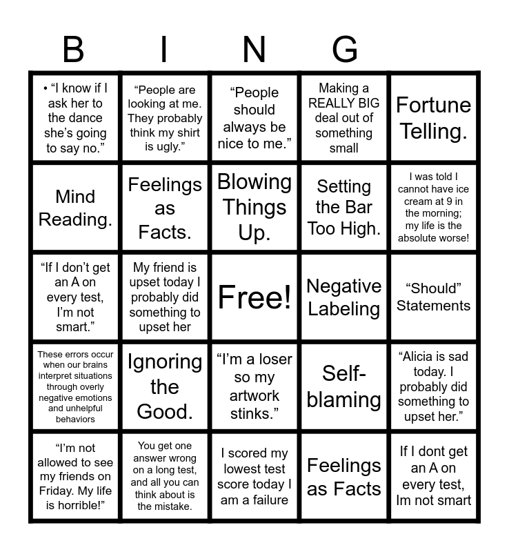 This bingo card has a free space and 24 words: Ignoring the Good., You get one answer wrong on a long test, and all you can think about is the mistake., Blowing Things Up., “I’m not allowed to see my friends on Friday. My life is horrible!”, Fortune Telling., • “I know if I ask her to the dance she’s going to say no.”, Mind Reading., “People are looking at me. They probably think my shirt is ugly.”, Negative Labeling, “I’m a loser so my artwork stinks.”, Setting the Bar Too High., “If I don’t get an A on every test, I’m not smart.”, Self-blaming, “Alicia is sad today. I probably did something to upset her.”, Feelings as Facts., Feelings as Facts, “Should” Statements, “People should always be nice to me.”, I was told I cannot have ice cream at 9 in the morning; my life is the absolute worse!, My friend is upset today I probably did something to upset her, If I dont get an A on every test, Im not smart, These errors occur when our brains interpret situations through overly negative emotions and unhelpful behaviors, Making a REALLY BIG deal out of something small and I scored my lowest test score today I am a failure.