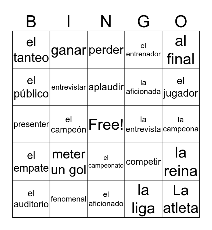 This bingo card has a free space and 24 words: meter un gol, fenomenal, aplaudir, el auditorio, al final, el tanteo, el público, ganar, la entrevista, el campeonato, la aficionada, presenter, competir, la reina, entrevistar, la liga, la campeona, perder, el jugador, el campeón, La atleta, el empate, el entrenador and el aficionado.