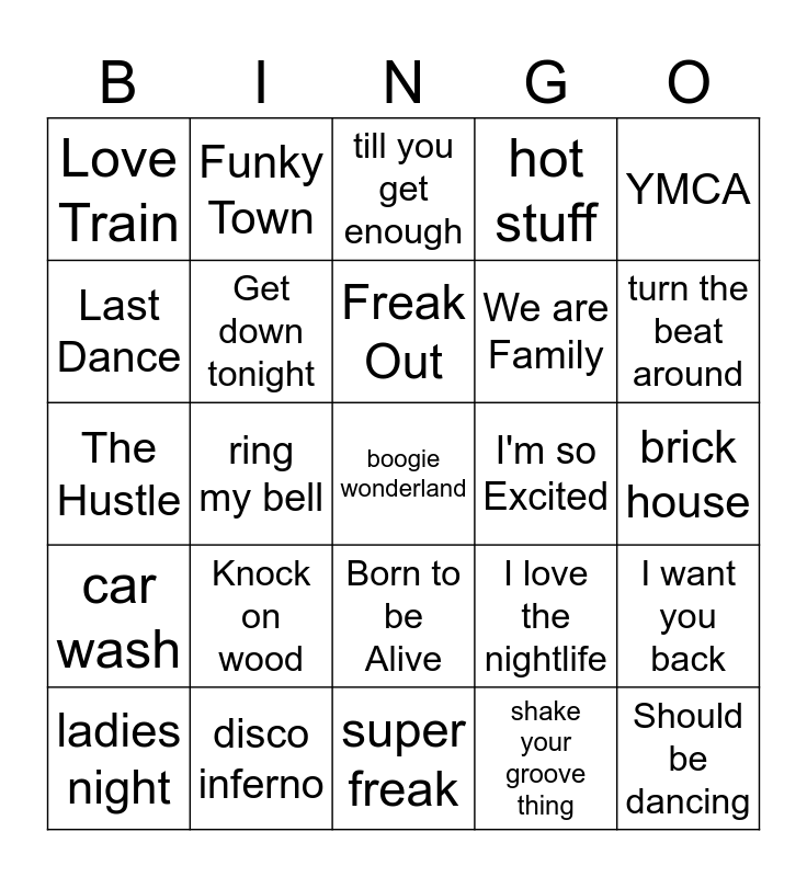 This bingo card has 25 words: Knock on wood, super freak, Freak Out, ladies night, YMCA, Love Train, Last Dance, Funky Town, I'm so Excited, Born to be Alive, We are Family, The Hustle, I love the nightlife, I want you back, Get down tonight, Should be dancing, brick house, till you get enough, turn the beat around, ring my bell, boogie wonderland, disco inferno, car wash, hot stuff and shake your groove thing.