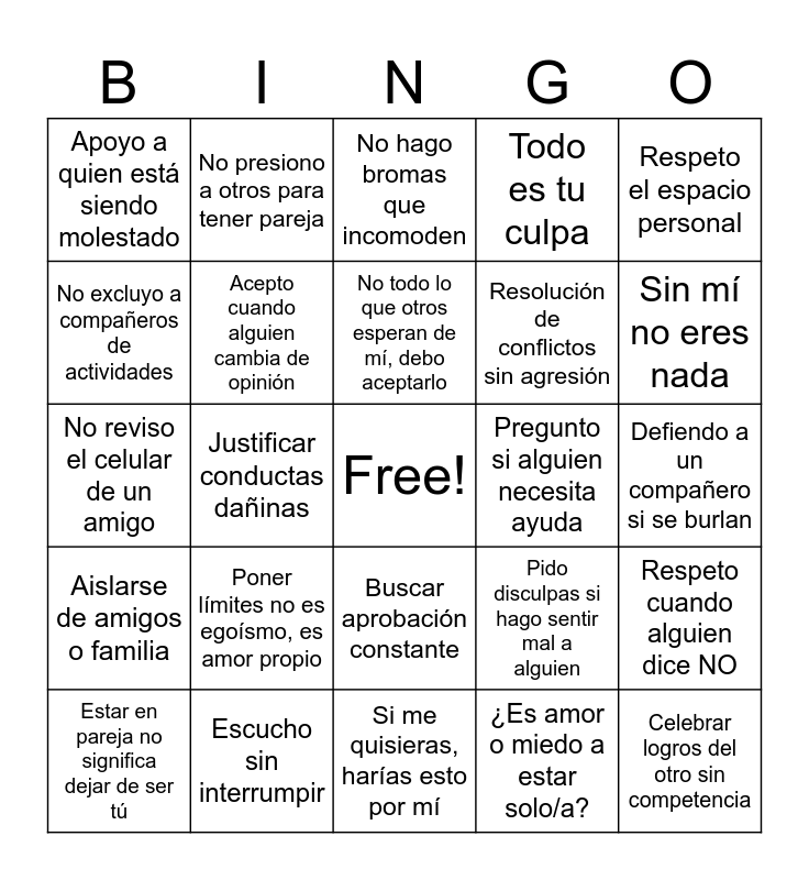 This bingo card has a free space and 24 words: Estar en pareja no significa dejar de ser tú, Poner límites no es egoísmo, es amor propio, No todo lo que otros esperan de mí, debo aceptarlo, ¿Es amor o miedo a estar solo/a?, Respeto el espacio personal, Apoyo a quien está siendo molestado, No presiono a otros para tener pareja, No hago bromas que incomoden, Pregunto si alguien necesita ayuda, Defiendo a un compañero si se burlan, No reviso el celular de un amigo, Acepto cuando alguien cambia de opinión, Pido disculpas si hago sentir mal a alguien, Respeto cuando alguien dice NO, No excluyo a compañeros de actividades, Escucho sin interrumpir, Si me quisieras, harías esto por mí, Todo es tu culpa, Sin mí no eres nada, Aislarse de amigos o familia, Justificar conductas dañinas, Buscar aprobación constante, Resolución de conflictos sin agresión and Celebrar logros del otro sin competencia.
