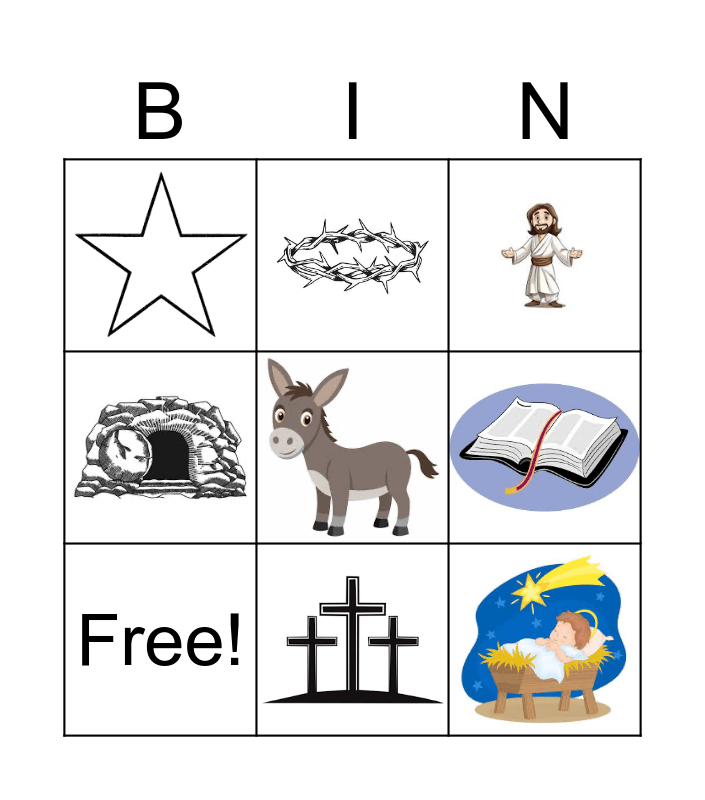 This bingo card has 8 images, a free space and 1 words: Free!.