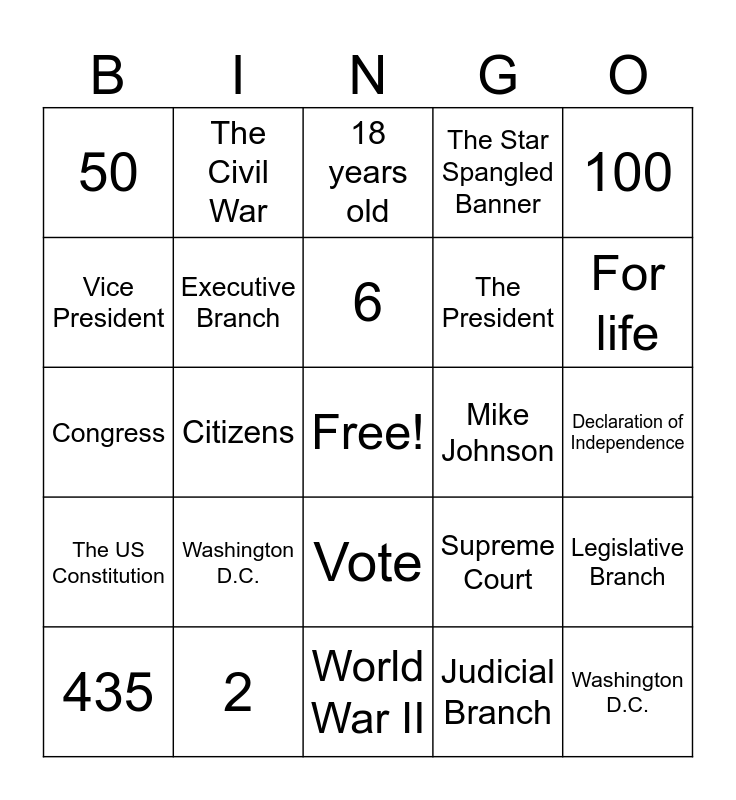 This bingo card has a free space and 24 words: Washington D.C., 2, 6, 435, 100, 50, Vice President, The Civil War, Mike Johnson, Vote, The President, Congress, Supreme Court, Legislative Branch, Executive Branch, Judicial Branch, Declaration of Independence, 18 years old, For life, Citizens, Washington D.C., The US Constitution, The Star Spangled Banner and World War II.