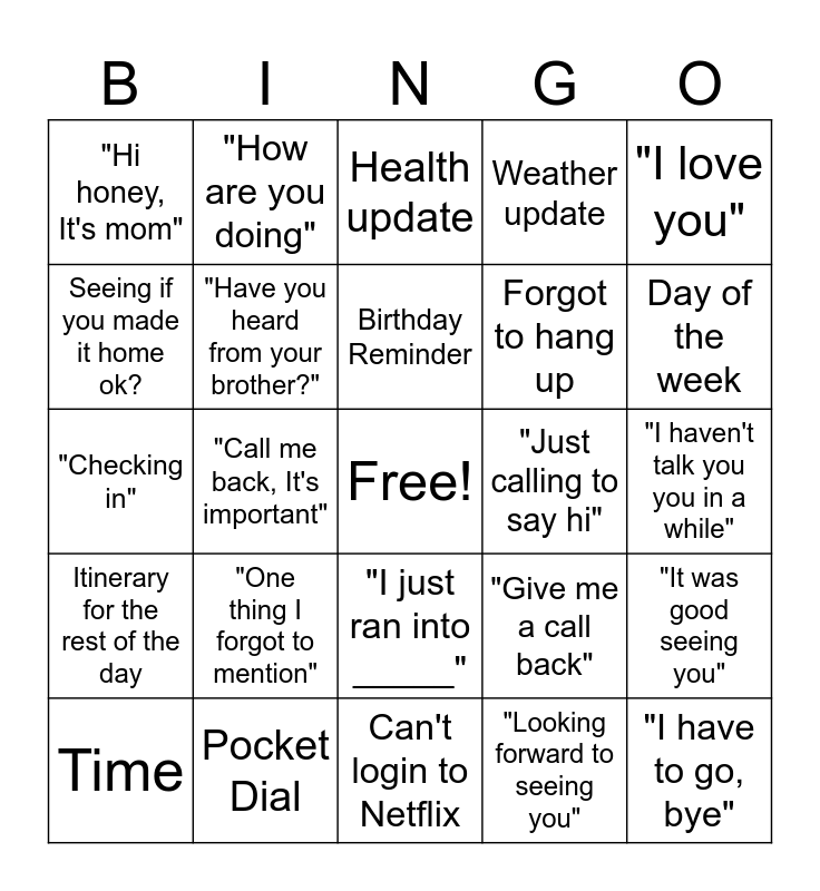 This bingo card has a free space and 24 words: Time, "One thing I forgot to mention", Birthday Reminder, "Looking forward to seeing you", "I love you", "Hi honey, It's mom", "How are you doing", Health update, "Just calling to say hi", "I haven't talk you you in a while", "Checking in", "Have you heard from your brother?", "Give me a call back", "It was good seeing you", Seeing if you made it home ok?, Pocket Dial, Can't login to Netflix, Weather update, Day of the week, Itinerary for the rest of the day, "Call me back, It's important", "I just ran into _____", Forgot to hang up and "I have to go, bye".