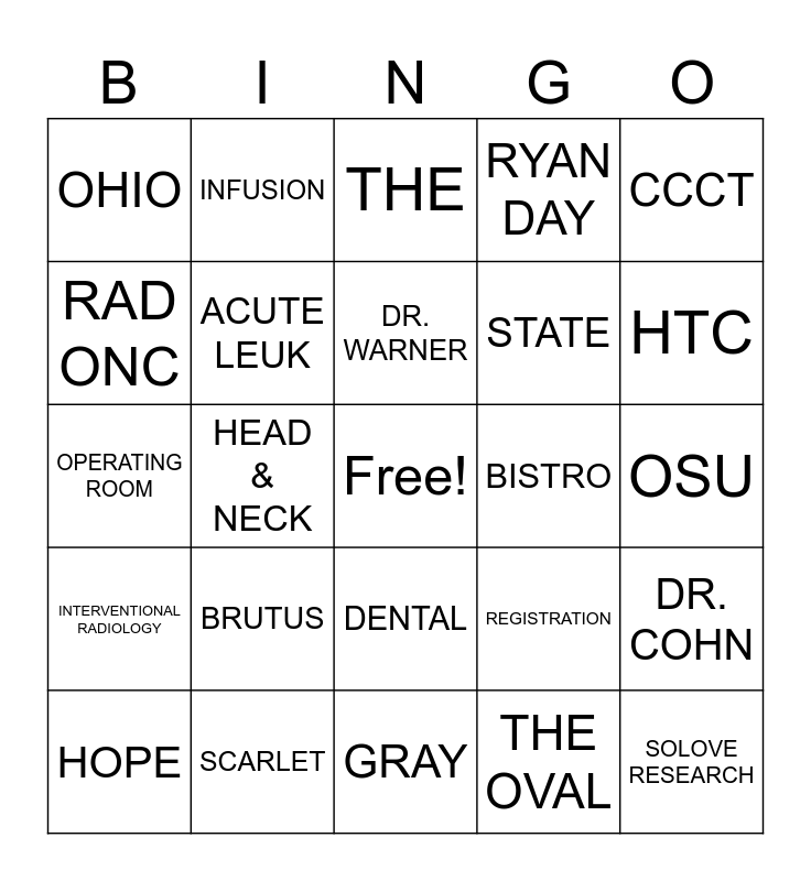 This bingo card has a free space and 24 words: BRUTUS, SCARLET, DR. WARNER, HOPE, CCCT, OHIO, RAD ONC, INFUSION, BISTRO, DENTAL, STATE, OPERATING ROOM, REGISTRATION, DR. COHN, ACUTE LEUK, THE OVAL, OSU, THE, HTC, HEAD & NECK, SOLOVE RESEARCH, INTERVENTIONAL RADIOLOGY, RYAN DAY and GRAY.