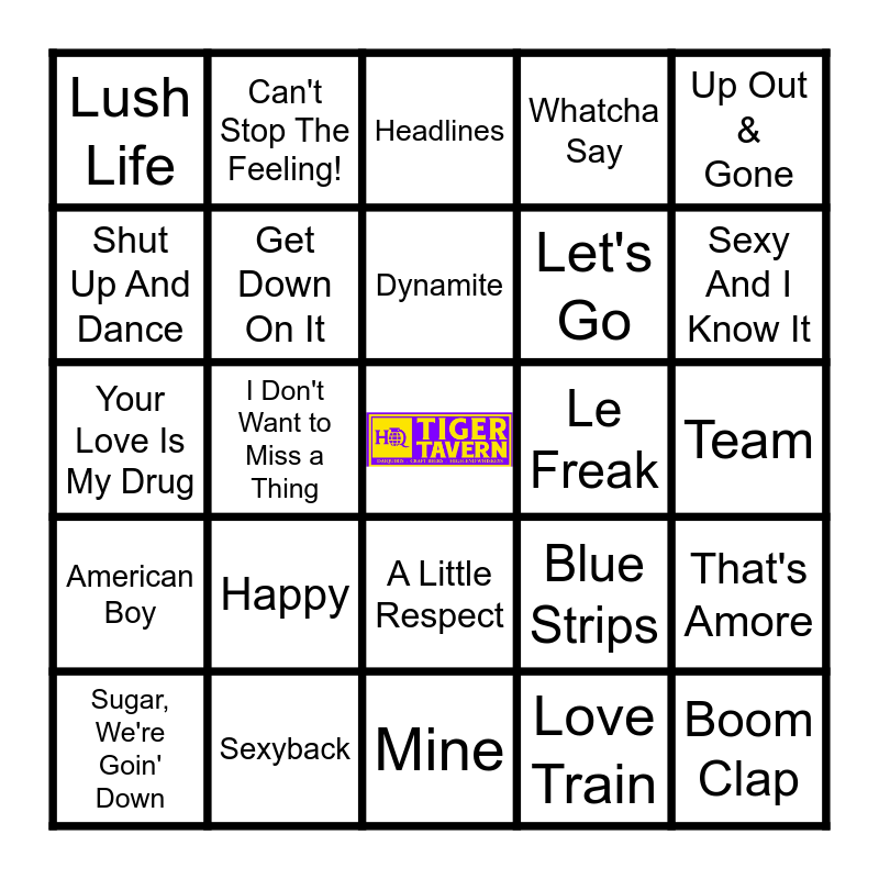 This bingo card has a free space and 84 words: Hysteria, Need Your Love, Headlines, iloveitiloveitiloveit, Motion Party, Freak Hoe, WHERE IS MY HUSBAND!, Peaches, The Door, Residuals, Redbone, Time Of Our Lives, Get Down On It, Le Freak, Accidentally In Love, Lush Life, Sugar, We're Goin' Down, Shut Up And Dance, Still Into You, If We Were a Movie, The Anthem, Let's Go, Boom Clap, Heat Waves, I Don't Want to Miss a Thing, I Want You Back, Dirty Little Secret, That's What I Like, Chariot, Chocolate, Happy, Let Me Love You, greedy, Your Love Is My Drug, I Will Survive, Big Energy, Mine, Feel It Still, Sexy And I Know It, American Boy, Sorry, Gimme Gimme, Peaches & Cream, Revival, Chasin' You, Habits, Can't Stop The Feeling!, Here I Go Again, Summertime Sadness, You Give Love A Bad Name, DJ Got Us Fallin' In Love, Blue Strips, Whatcha Say, Bulletproof, One Last Breath, Love On Top, Sexyback, Dynamite, Let's Groove Tonight, Team, Pocketful Of Sunshine, Wild Ones, Pound the Alarm, Without You, Wrecking Ball, The Show Goes On, Freak Like Me, Listen to the Music, Up Out & Gone, Easy Lover, That's Amore, Make Me Lose Control, Play Hard, A Lap Dance Is So Much Better When The Stripper's Crying, A Little Respect, Love Train, Drops of Jupiter, Movin on Up, Haterz, A Bar Song, Headsprung, No Woman, No Cry, Womanizer and Let Me Down Easy.