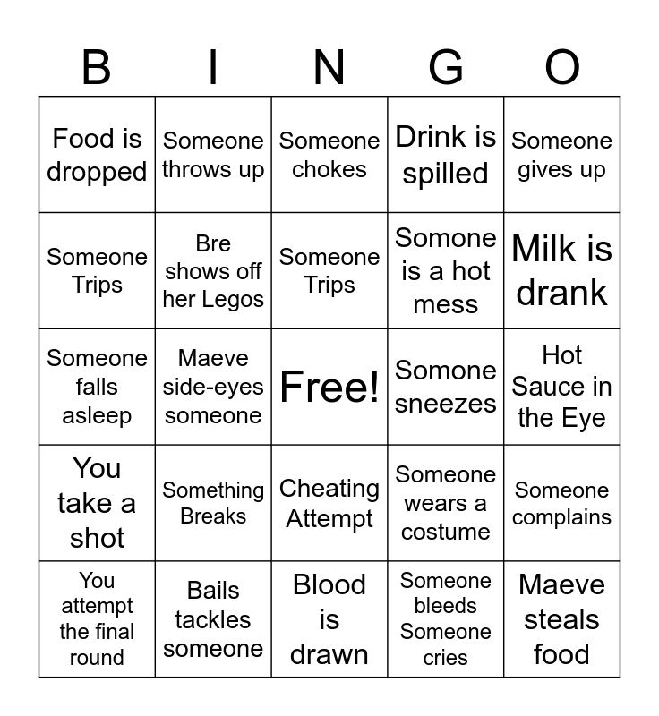 This bingo card has a free space and 24 words: Something Breaks, Bails tackles someone, Someone Trips, You attempt the final round, Someone gives up, Food is dropped, Someone Trips, Someone throws up, Somone sneezes, Cheating Attempt, Somone is a hot mess, Someone falls asleep, Someone wears a costume, Someone complains, Bre shows off her Legos, Someone bleeds Someone cries, Hot Sauce in the Eye, Someone chokes, Milk is drank, Maeve side-eyes someone, Maeve steals food, You take a shot, Drink is spilled and Blood is drawn.