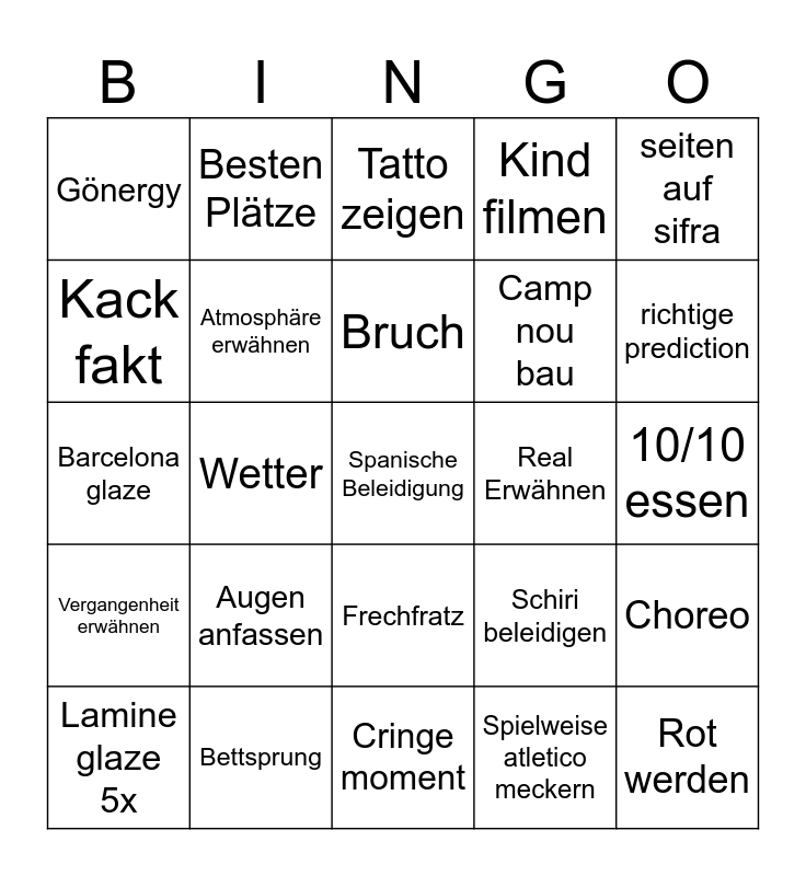 This bingo card has a free space and 24 words: Augen anfassen, Bettsprung, Bruch, Lamine glaze 5x, seiten auf sifra, Gönergy, Kack fakt, Besten Plätze, Real Erwähnen, Frechfratz, Camp nou bau, Barcelona glaze, Schiri beleidigen, Choreo, Atmosphäre erwähnen, Spielweise atletico meckern, 10/10 essen, Tatto zeigen, richtige prediction, Wetter, Rot werden, Vergangenheit erwähnen, Kind filmen and Cringe moment.