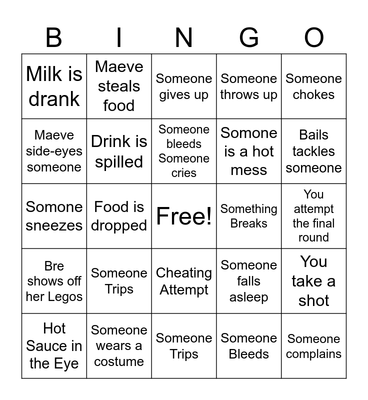This bingo card has a free space and 24 words: Someone Trips, Someone wears a costume, Someone bleeds Someone cries, Hot Sauce in the Eye, Someone chokes, Milk is drank, Maeve side-eyes someone, Maeve steals food, Something Breaks, Cheating Attempt, Somone is a hot mess, Somone sneezes, Someone falls asleep, You take a shot, Drink is spilled, Someone Bleeds, You attempt the final round, Someone gives up, Bails tackles someone, Food is dropped, Someone complains, Bre shows off her Legos, Someone throws up and Someone Trips.