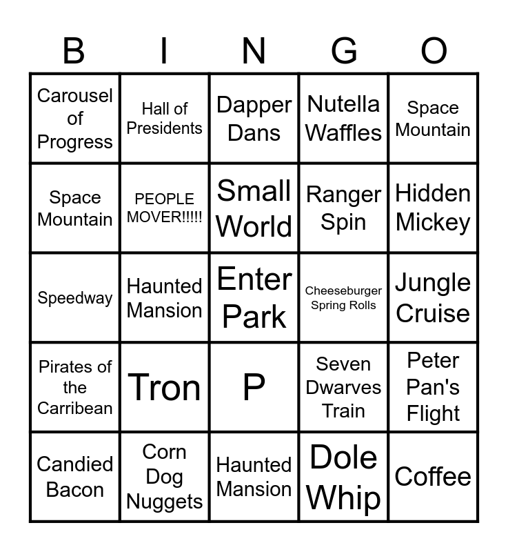 This bingo card has a free space and 24 words: Tron, Corn Dog Nuggets, Small World, Candied Bacon, Space Mountain, Carousel of Progress, Space Mountain, Hall of Presidents, Cheeseburger Spring Rolls, P, Ranger Spin, Speedway, Seven Dwarves Train, Peter Pan's Flight, PEOPLE MOVER!!!!!, Dole Whip, Jungle Cruise, Dapper Dans, Hidden Mickey, Haunted Mansion, Coffee, Pirates of the Carribean, Nutella Waffles and Haunted Mansion.