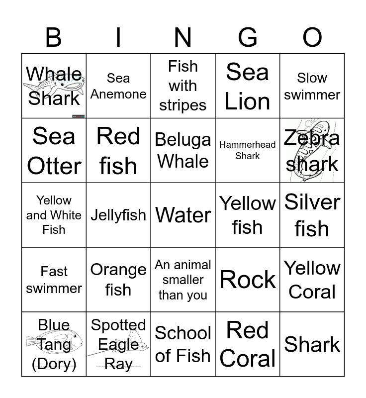 This bingo card has 4 images, a free space and 31 words: School of Fish, Kelp/Seaweed, Jellyfish, Mantaray or Stingray, Whale Shark, Fish with stripes, Red fish, Rock, Yellow fish, Red Coral, Silver fish, Shark, An animal bigger than you, Penguin, Zebra shark, Blue fish, Yellow Coral, Orange fish, Fast swimmer, An animal smaller than you, Slow swimmer, Fish close to the camera, Blue Tang (Dory), Sea Anemone, Hammerhead Shark, Sea Otter, Sea Lion, Yellow and White Fish, Spotted Eagle Ray, Beluga Whale and No animals on screen.