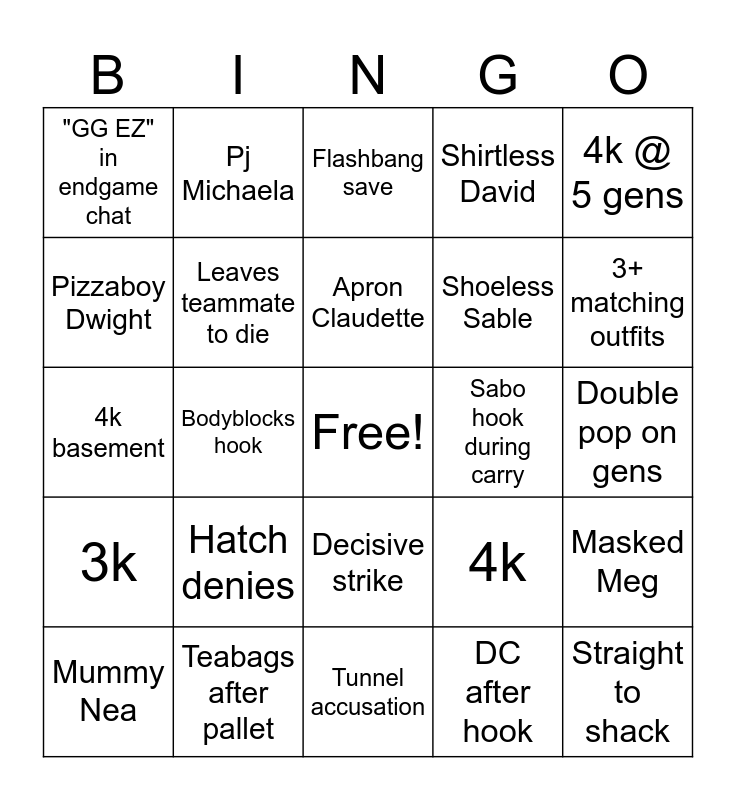 This bingo card has a free space and 30 words: Teabags after pallet, Team teabag @ door, Bodyblocks hook, Clickity squad, "GG EZ" in endgame chat, Flashbang save, Leaves teammate to die, Decisive strike, Sabo hook during carry, Tunnel accusation, Double pop on gens, Straight to shack, DC after hook, Hatch escape, 3+ matching outfits, 2+ TTVers, 4k, 3k, Hatch denies, 4k @ 5 gens, 4k basement, 4 toolboxes, Pj Michaela, Shoeless Sable, Pizzaboy Dwight, Shirtless David, Masked Meg, Mummy Nea, Apron Claudette and Whiffs M1.