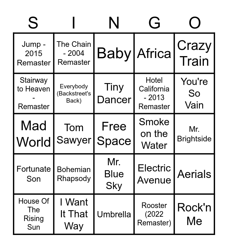 This bingo card has a free space and 67 words: Count Bubba, Symphony Of Destruction, Master of Puppets (Remastered), Aerials, Piano Man, I'm Still Standing, The Chain - 2004 Remaster, Rocket Man (I Think It's Going To Be A Long, Long Time), Tiny Dancer, California Dreamin', Mr. Blue Sky, Material Girl, Mr. Brightside, Crazy Train, Back In Black, Stairway to Heaven - Remaster, Tom Sawyer, Jump - 2015 Remaster, (I Just) Died In Your Arms, Hotel California - 2013 Remaster, Bohemian Rhapsody, Fortunate Son, Africa, Rooster (2022 Remaster), All Along The Watchtower, Roundabout - 2008 Remaster, Ironic, Paint it, black, You're So Vain, Danger Zone - From "Top Gun" Original Soundtrack, Rock'n Me, I'm Gonna Be (500 Miles), Steve's Lava Chicken, Island In The Sun, Free Bird, House Of The Rising Sun, Carry on Wayward Son, Electric Avenue, Mad World, My Way - 2008 Remastered, Yesterday - Remastered 2009, Everybody (Backstreet's Back), Smoke on the Water, Firework, Stateside + Zara Larsson, Wannabe, Unwritten, I Want It That Way, Dancing Queen, Borderline, Baby, Party In The U.S.A., Mamma Mia, Dance The Night, Crazy In Love (feat. JAY-Z), Umbrella, Everybody Wants To Rule The World, Don't Stop Believin' (2022 Remaster), Escape (The Pina Colada Song), Stayin' Alive, Eye of the Tiger, Hooked On A Feeling, Beat It, All Star, Never Gonna Give You Up, Call Me Maybe and Sweet Home Alabama.