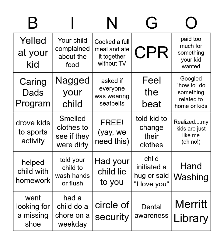 This bingo card has a free space and 33 words: Repeated yourself 3 or more times on one topic, read a food label to see what's in it, Smelled clothes to see if they were dirty, did a family activity together (not TV), helped child with homework, Nagged your child, paid too much for something your kid wanted, went looking for a missing shoe, Your child complained about the food, Sounded like your parents, asked if everyone was wearing seatbelts, Cooked a full meal and ate it together without TV, Used electronics to babysit, Stepped on a Lego, told kid to change their clothes, Googled "how to" do something related to home or kids, had a child do a chore on a weekday, drove kids to sports activity, told your child to wash hands or flush, child initiated a hug or said "I love you", Had your child lie to you, Forgot an appointment, Yelled at your kid, Realized....my kids are just like me (oh no!), circle of security, Merritt Library, CPR, Feel the beat, Caring Dads Program, Hand Washing, car seat safety, Dental awareness and sign language.