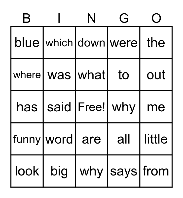 This bingo card has a free space and 35 words: one, two, three, was, are, were, where, there, what, is, has, the, red, yellow, blue, why, says, said, funny, from, all, look, little, big, down, out, of, so, to, me, and, why, word, which and here.