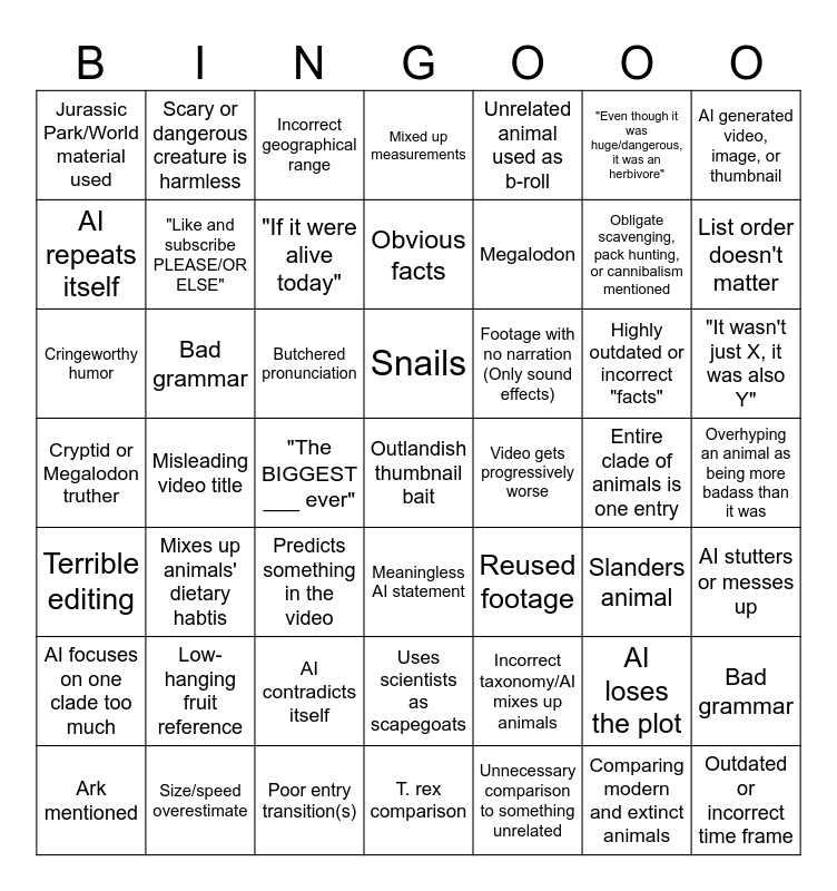 This bingo card has a free space and 48 words: Incorrect taxonomy/AI mixes up animals, Obligate scavenging, pack hunting, or cannibalism mentioned, T. rex comparison, Misleading video title, Butchered pronunciation, Overhyping an animal as being more badass than it was, Scary or dangerous creature is harmless, Size/speed overestimate, "Even though it was huge/dangerous, it was an herbivore", Meaningless AI statement, AI generated video, image, or thumbnail, Mixed up measurements, Highly outdated or incorrect "facts", Footage with no narration (Only sound effects), AI focuses on one clade too much, Entire clade of animals is one entry, AI repeats itself, List order doesn't matter, AI loses the plot, Unrelated animal used as b-roll, Megalodon, "The BIGGEST ___ ever", Jurassic Park/World material used, "Like and subscribe PLEASE/OR ELSE", Bad grammar, "If it were alive today", "It wasn't just X, it was also Y", Ark mentioned, Snails, Bad grammar, Comparing modern and extinct animals, Video gets progressively worse, AI stutters or messes up, Low-hanging fruit reference, Cryptid or Megalodon truther, Reused footage, Slanders animal, Cringeworthy humor, Predicts something in the video, AI contradicts itself, Terrible editing, Outdated or incorrect time frame, Incorrect geographical range, Poor entry transition(s), Obvious facts, Uses scientists as scapegoats, Mixes up animals' dietary habtis and Unnecessary comparison to something unrelated.