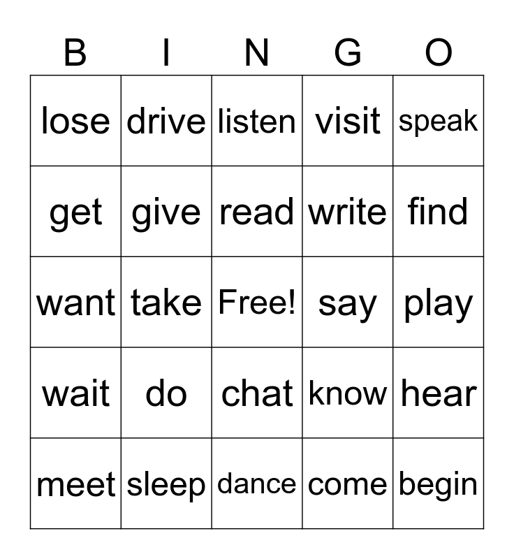 This bingo card has a free space and 53 words: be, begin, buy, come, do, drink, drive, eat, get, go, give, have, hear, know, leave, meet, read, say, see, speak, take, think, write, lose, make, sleep, fly, tell, ride, find, brake, stay, watch, cook, play, use, visit, dance, listen, travel, study, text, play, clean, walk, chat, start, need, want, wait, pay, wash and brush.