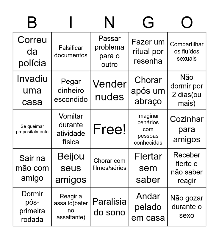 This bingo card has a free space and 24 words: Beijou seus amigos, Reagir a assalto(bater no assaltante), Vender nudes, Dormir pós-primeira rodada, Compartilhar os fluídos sexuais, Correu da polícia, Invadiu uma casa, Falsificar documentos, Imaginar cenários com pessoas conhecidas, Chorar com filmes/séries, Chorar após um abraço, Se queimar propositalmente, Flertar sem saber, Receber flerte e não saber reagir, Pegar dinheiro escondido, Andar pelado em casa, Cozinhar para amigos, Passar problema para o outro, Não dormir por 2 dias(ou mais), Vomitar durante atividade física, Não gozar durante o sexo, Sair na mão com amigo, Fazer um ritual por resenha and Paralisia do sono.