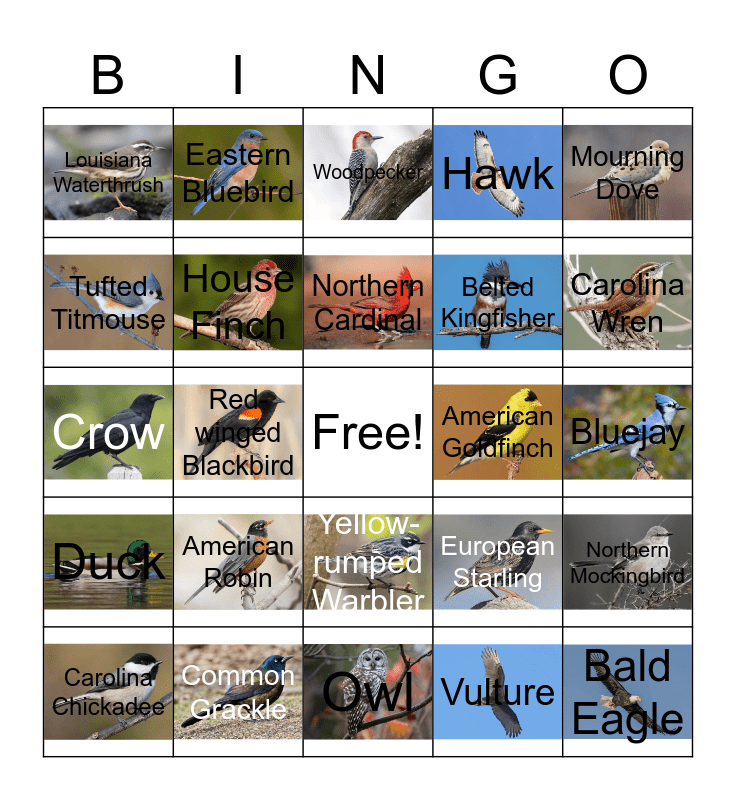 This bingo card has 24 images, a free space and 24 words: American Robin, Common Grackle, Northern Cardinal, Carolina Chickadee, Mourning Dove, Louisiana Waterthrush, Tufted Titmouse, Eastern Bluebird, American Goldfinch, Yellow-rumped Warbler, Belted Kingfisher, Crow, European Starling, Northern Mockingbird, House Finch, Vulture, Bluejay, Woodpecker, Carolina Wren, Red-winged Blackbird, Bald Eagle, Duck, Hawk and Owl.