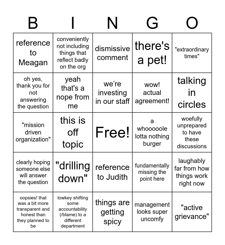 This bingo card has a free space and 24 words: "drilling down", lowkey shifting some accountability (/blame) to a different department, we’re investing in our staff, oopsies! that was a bit more transparent and honest than they planned to be, "extraordinary times", reference to Meagan, oh yes, thank you for not answering the question, conveniently not including things that reflect badly on the org, a whooooole lotta nothing burger, reference to Judith, wow! actual agreement!, "mission driven organization", fundamentally missing the point here, laughably far from how things work right now, yeah that's a nope from me, management looks super uncomfy, woefully unprepared to have these discussions, dismissive comment, talking in circles, this is off topic, "active grievance", clearly hoping someone else will answer the question, there's a pet! and things are getting spicy.