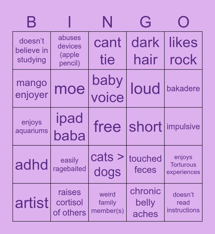 This bingo card has a free space and 24 words: artist, easily ragebaited, baby voice, chronic belly aches, likes rock, doesn’t believe in studying, abuses devices (apple pencil), cant tie, short, impulsive, enjoys aquariums, moe, touched feces, enjoys Torturous experiences, mango enjoyer, raises cortisol of others, weird family member(s), dark hair, bakadere, adhd, ipad baba, cats > dogs, loud and doesn’t read instructions.
