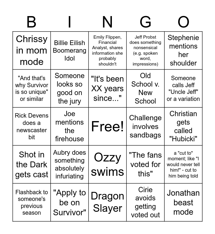 This bingo card has a free space and 27 words: "The fans voted for this", RIZGOD, Old School v. New School, Dragon Slayer, "And that's why Survivor is so unique" or similar, Emily Flippen, Financial Analyst, shares information she probably shouldn't, Billie Eilish Boomerang Idol, Shot in the Dark gets cast, Challenge involves sandbags, a "cut to" moment; like "I would never tell him!" - cut to him being told, Rick Devens does a newscaster bit, Jeff Probst does something nonsensical (e.g. spoken word, impressions), Flashback to someone's previous season, "Apply to be on Survivor", Someone calls Jeff "Uncle Jeff" or a variation, Talk of "honor and integrity", Someone looks so good on the jury, "It's been XX years since...", Aubry does something absolutely infuriating, Chrissy in mom mode, Christian gets called "Hubicki", Cirie avoids getting voted out, Joe mentions the firehouse, Jonathan beast mode, Ozzy swims, Stephenie mentions her shoulder and Tiffany imitates someone in confessionals.