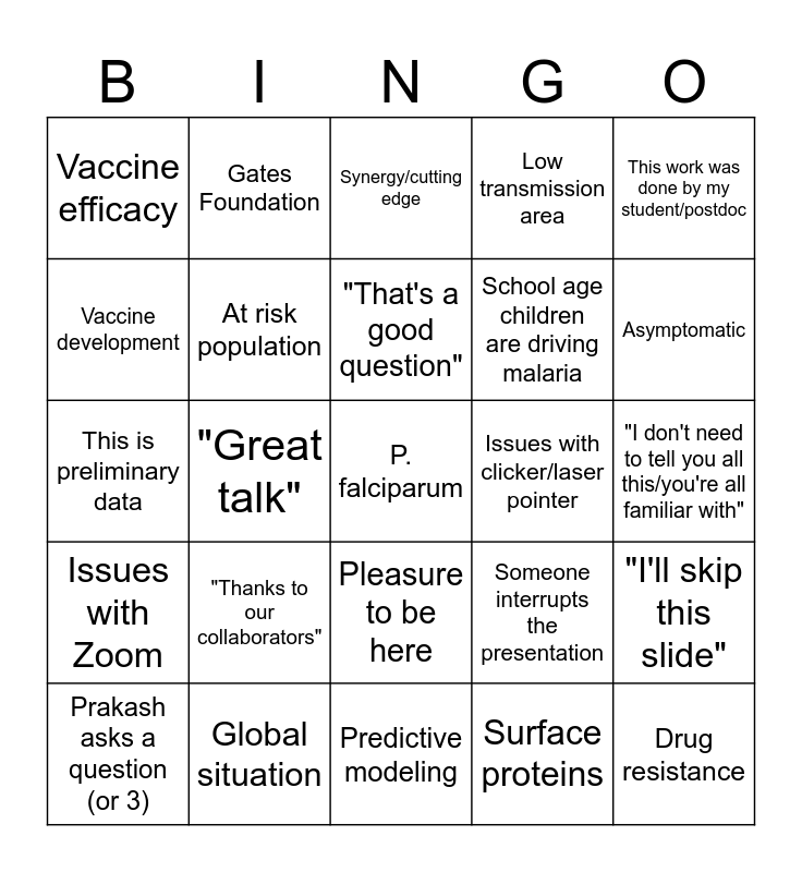 This bingo card has a free space and 28 words: "I'll skip this slide", Flow cytrometry data, School age children are driving malaria, Surface proteins, Vaccine development, Synergy/cutting edge, Gates Foundation, Issues with Zoom, Issues with clicker/laser pointer, Prakash asks a question (or 3), This is preliminary data, Low transmission area, Global situation, Predictive modeling, Asymptomatic, "I hope you can appreciate", "Thanks to our collaborators", At risk population, "That's a good question", Pleasure to be here, Vaccine efficacy, Mosquito, Drug resistance, "Great talk", "I don't need to tell you all this/you're all familiar with", Someone interrupts the presentation, This work was done by my student/postdoc and Runs over time.