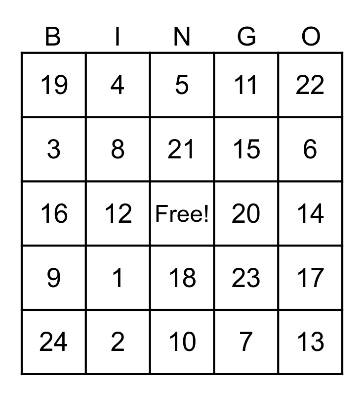 This bingo card has a free space and 24 words: 1, 2, 21, 24, 22, 19, 3, 4, 20, 18, 15, 16, 23, 17, 8, 7, 14, 5, 6, 12, 13, 9, 11 and 10.