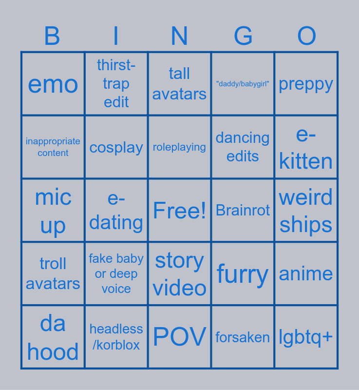 This bingo card has a free space and 24 words: fake baby or deep voice, headless /korblox, roleplaying, da hood, preppy, emo, inappropriate content, thirst-trap edit, Brainrot, story video, dancing edits, mic up, furry, anime, cosplay, forsaken, weird ships, tall avatars, e-kitten, e-dating, lgbtq+, troll avatars, "daddy/babygirl" and POV.