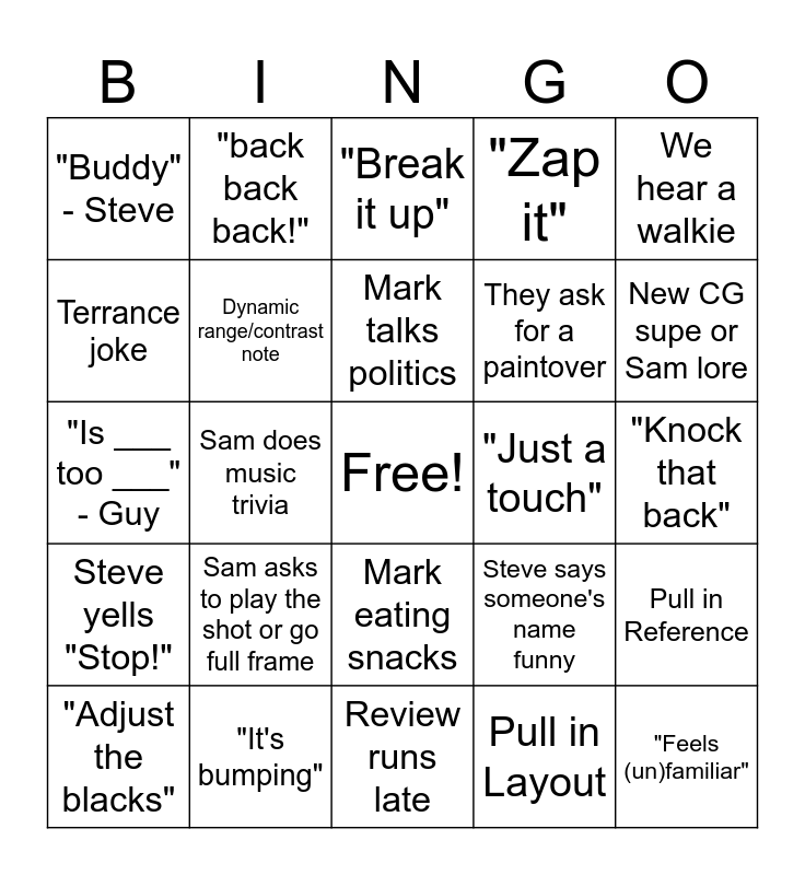 This bingo card has a free space and 39 words: "A kiss of ___", "Washed", "Milky", Dynamic range/contrast note, "Adjust the blacks", Mark eating snacks, Mark talks politics, Brad has Hiero/Zoom Issues, We hear a walkie, Steve yells "Stop!", Sam does music trivia, "Zap it", "Feels (un)familiar", "Knock that back", "Just a touch", Sam asks to play the shot or go full frame, "Who's driving back there", "Buddy" - Steve, "Just to ask the question", Steve says someone's name funny, Terrance joke, Review runs late, They ask for a paintover, New CG supe or Sam lore, "What else?", "Specky", "Can we buzz that", "Feels Samey", "ALRIGHT!" - Steve, "back back back!", "Let's watch it on the run", "Electric/Atomic", "Break it up", "It's bumping", Pull in Layout, Pull in Hanm, Pull in Reference, "Is ___ too ___" - Guy and "Everybody good?".