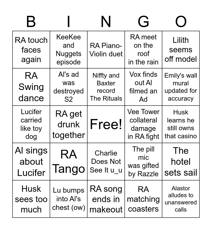 This bingo card has a free space and 24 words: RA Tango, Lu bumps into Al's chest (ow), Niffty and Baxter record The Rituals, Husk sees too much, Lilith seems off model, RA touch faces again, RA Swing dance, KeeKee and Nuggets episode, Vee Tower collateral damage in RA fight, Charlie Does Not See It u_u, Vox finds out Al filmed an Ad, Lucifer carried like toy dog, The pill mic was gifted by Razzle, The hotel sets sail, Al's ad was destroyed S2, RA matching coasters, Husk learns he still owns that casino, RA Piano-Violin duet, Emily's wall mural updated for accuracy, RA get drunk together, Alastor alludes to unanswered calls, Al sings about Lucifer, RA meet on the roof in the rain and RA song ends in makeout.