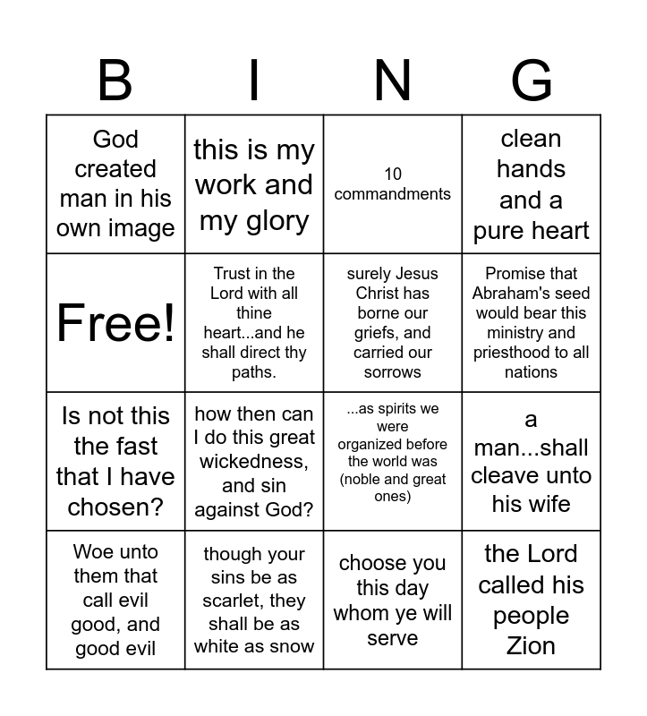 This bingo card has 16 words: though your sins be as scarlet, they shall be as white as snow, a man...shall cleave unto his wife, 10 commandments, God created man in his own image, Is not this the fast that I have chosen?, this is my work and my glory, ...as spirits we were organized before the world was (noble and great ones), choose you this day whom ye will serve, Free!, Trust in the Lord with all thine heart...and he shall direct thy paths., Woe unto them that call evil good, and good evil, clean hands and a pure heart, how then can I do this great wickedness, and sin against God?, Promise that Abraham's seed would bear this ministry and priesthood to all nations, surely Jesus Christ has borne our griefs, and carried our sorrows and the Lord called his people Zion.