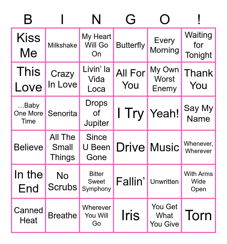 This bingo card has 66 words: Free!, Unwritten, Oops!...I Did It Again, All The Small Things, No Scrubs, Bye Bye Bye, Milkshake, Complicated, Crazy In Love, I’m Like A Bird, Say My Name, Ms. Jackson, Drops of Jupiter, Every Morning, Smooth, Waiting for Tonight, Thank You, Kiss Me, Intergalactic, Livin’ la Vida Loca, Yeah!, I Try, Butterfly, Canned Heat, U Got It Bad, You Get What You Give, Wherever You Will Go, I Knew I Loved You, …Baby One More Time, In Da Club, Since U Been Gone, Lady Marmalade, Hey Ya!, Steal My Sunshine, Believe, Drive, Teenage Dirtbag, My Own Worst Enemy, Whenever, Wherever, Torn, This Love, Bitter Sweet Symphony, Senorita, Lose Yourself, Genie In a Bottle, Breathe, All For You, Can’t Get You out of My Head, In the End, Fallin’, Hot In Herre, Lovefool, Who Let The Dogs Out, The Middle, Everybody (Backstreet’s Back), With Arms Wide Open, It’s Gonna Be Me, Hanging By A Moment, My Heart Will Go On, Music, Iris, You’re Still The One, American Woman, Love Don’t Cost a Thing, Heartbreaker and Get the Party Started.