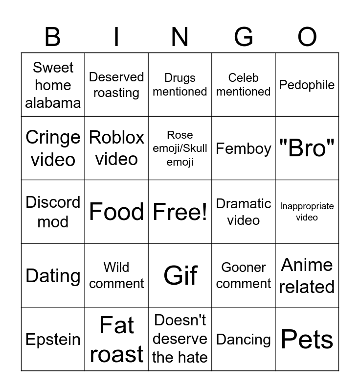 This bingo card has a free space and 24 words: Wild comment, Fat roast, Rose emoji/Skull emoji, Epstein, Pedophile, Sweet home alabama, Cringe video, Deserved roasting, Dramatic video, Gif, Femboy, Discord mod, Gooner comment, Anime related, Roblox video, Dancing, Inappropriate video, Drugs mentioned, "Bro", Food, Pets, Dating, Celeb mentioned and Doesn't deserve the hate.
