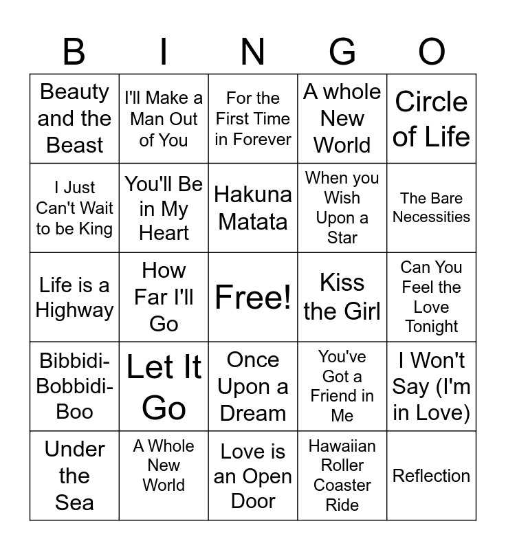This bingo card has a free space and 24 words: Let It Go, A Whole New World, Hakuna Matata, Under the Sea, Circle of Life, Beauty and the Beast, I Just Can't Wait to be King, I'll Make a Man Out of You, Kiss the Girl, Once Upon a Dream, When you Wish Upon a Star, Life is a Highway, You've Got a Friend in Me, I Won't Say (I'm in Love), You'll Be in My Heart, Hawaiian Roller Coaster Ride, Can You Feel the Love Tonight, For the First Time in Forever, The Bare Necessities, How Far I'll Go, Reflection, Bibbidi-Bobbidi-Boo, A whole New World and Love is an Open Door.