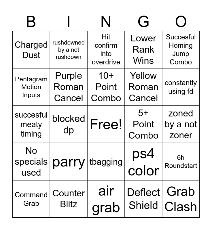 This bingo card has a free space and 62 words: No meter use, Counter Blitz, Burst after 1 hit, No specials used, No Overdrives Used, Red Roman Cancel, Purple Roman Cancel, Blue Roman Cancel, Yellow Roman Cancel, Lower RP wins, Lower Rank Wins, Mashing in corner, Pentagram Motion Inputs, Gimmick Char w/o gimmick, 1 special move spam, Charged Dust, Grab Clash, Succesful Homing Jump Combo, Succesful corner carry combo (with wallbreak), 10+ Point Combo, 5+ Point Combo, Hit confirm into overdrive, Command Grab, Deflect Shield, Conversion off 6p, Perfect Round, 2-0 Match, Accidental RC, 6h Roundstart, 2k>2d, Dash Cancel used, Only 1 button entire match, failing to jump over projectile, zoned the entire match, zoned by a not zoner, rushdowned by a not rushdown, accidental jump during motion, attack clash, blocked dp, blocked overhead (from low blocking), succesful meaty timing, succesful safejump, parry, just block, constantly using fd, ps4 color, manga color, previous game color, cyperpunk color, taunt, tbagging, air grab, run up fullscreen grab, same roundstart 2 matches in a row, backdash roundstart, jump roundstart, previous game song (same character), drift roman cancel, cuck song (using a different characters strive theme), Accent core song, non character song and non default stage.