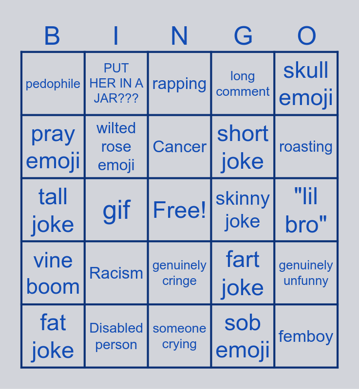 This bingo card has a free space and 24 words: Racism, Disabled person, Cancer, fat joke, skull emoji, pedophile, pray emoji, PUT HER IN A JAR???, skinny joke, genuinely cringe, short joke, tall joke, fart joke, genuinely unfunny, wilted rose emoji, sob emoji, "lil bro", rapping, roasting, gif, femboy, vine boom, long comment and someone crying.